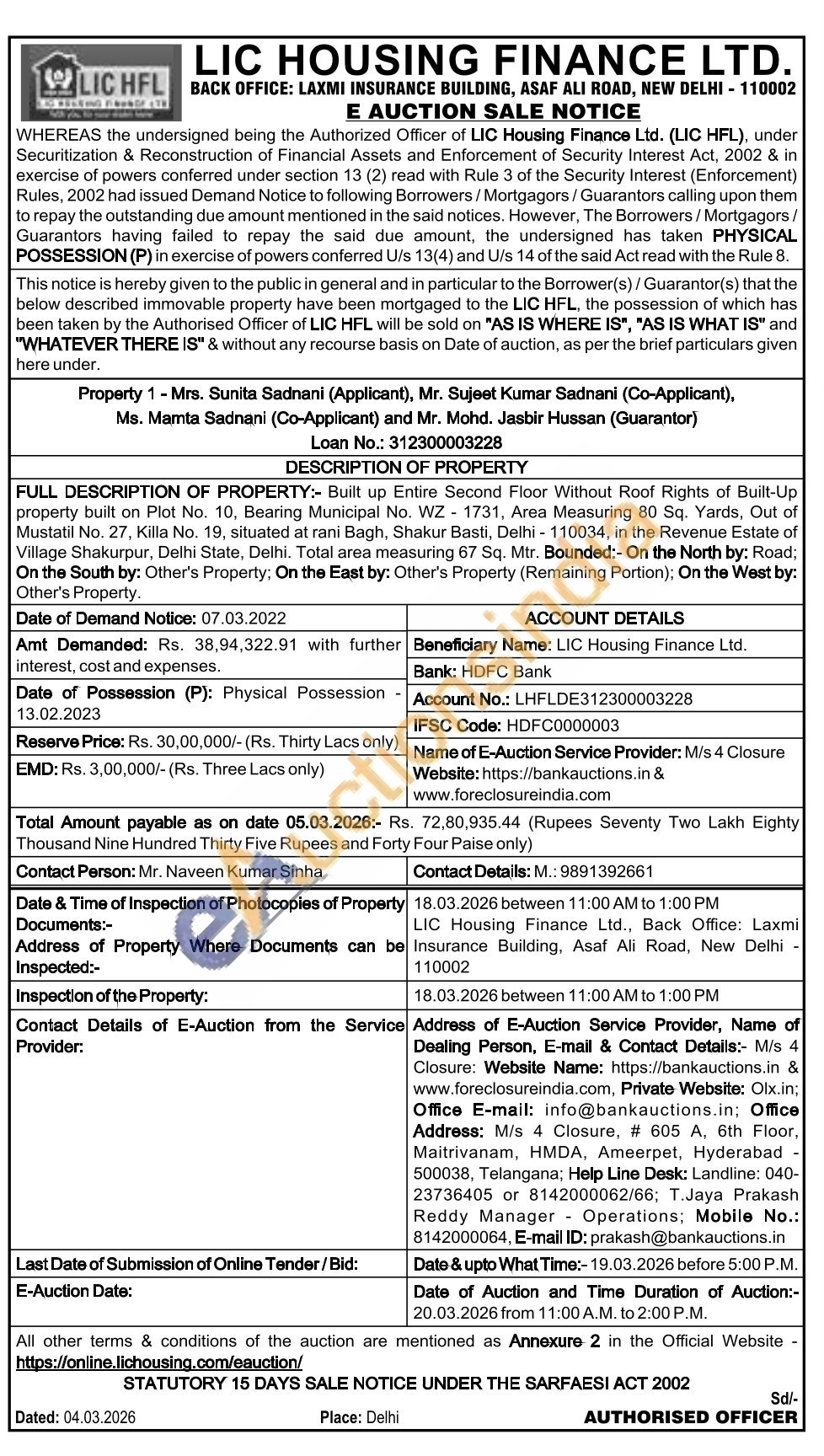 FULL DESCRIPTION OF PROPERTY:- Built up Entire Second Floor Without Roof Rights of Built-Up property built on Plot No. 10, Bearing Municipal No. WZ-1731, Area Measuring 80 Sq. Yards, Out of Mustatil No. 27, Killa No. 19, situated at rani Bagh, Shakur Basti, Delhi-110034, in the Revenue Estate of Village Shakurpur, Delhi State, Delhi. Total area measuring 67 Sq. Mtr. Bounded:- On the North by: Road; On the South by: Other's Property: On the East by: Other's Property (Remaining Portion); On the West by: Other's Property.