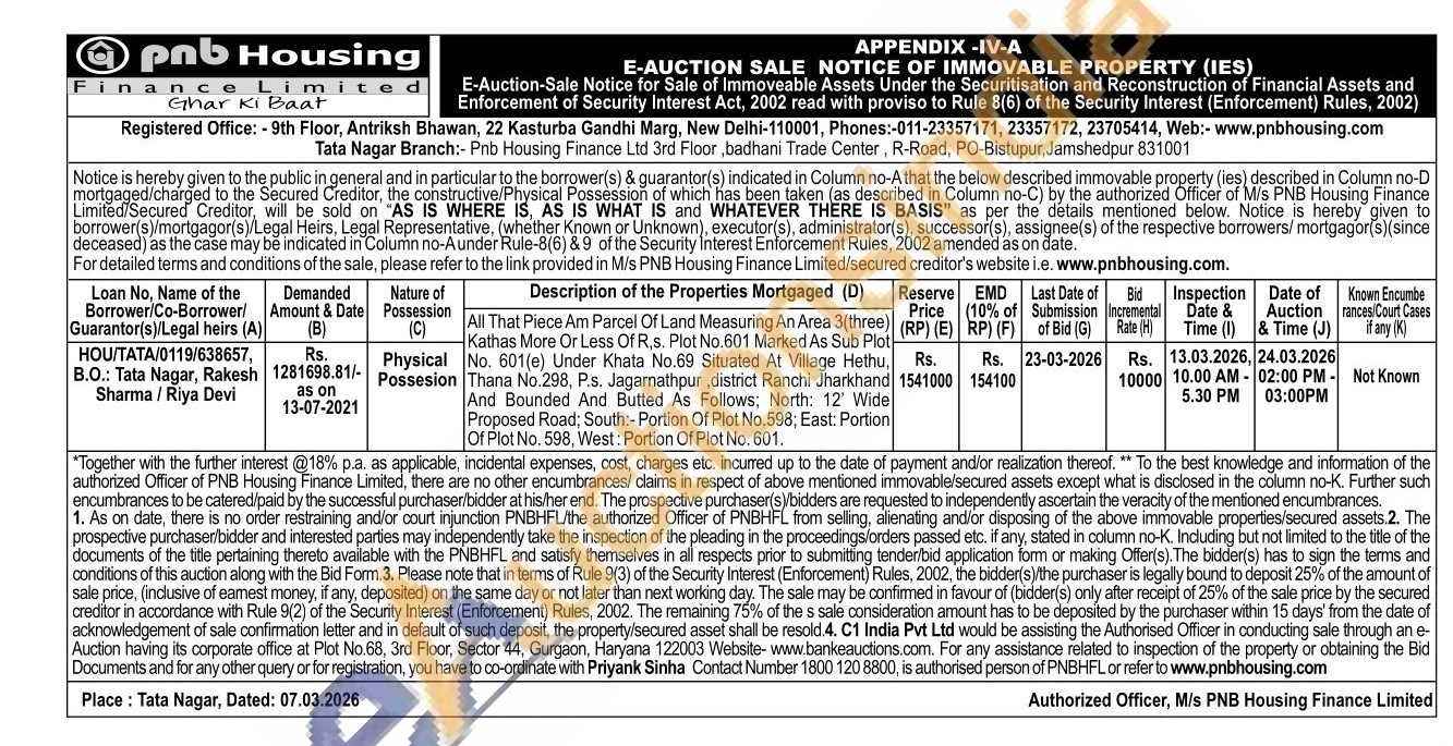 All That Piece Am Parcel Of Land Measuring An Area 3 (three) Kathas More Or Less Of R,s. Plot No.601 Marked As Sub Plot No. 601(e) Under Khata No.69 Situated At Village Hethu, Thana No.298, P.s. Jagarnathpur, district Ranchi Jharkhand And Bounded And Butted As Follows; North: 12' Wide Proposed Road; South:- Portion Of Plot No.598; East: Portion Of Plot No. 598, West: Portion Of Plot No. 601