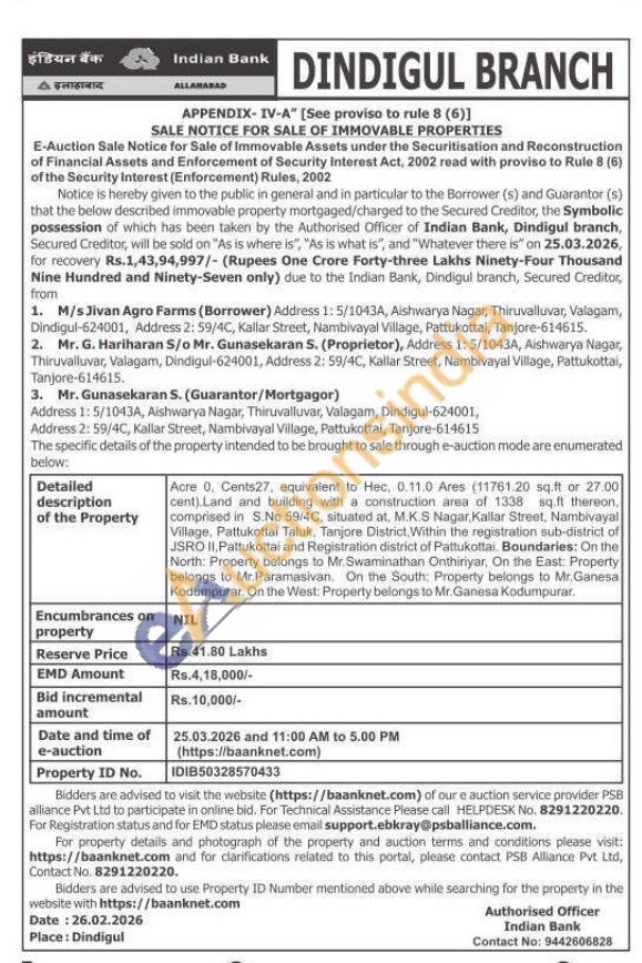 Acre 0. Cents27, equivalent to Hec, 0.11.0 Ares (11761.20 sq.ft or 27.00 cent). Land and building with a construction area of 1338 sq.ft thereon, comprised in S.No.59/4C, situated at. M.K.S Nagar, Kallar Street, Nambivayal Village, Pattukottai Taluk, Tanjore District. Within the registration sub-district of JSRO II, Pattukottai and Registration district of Pattukottai. Boundaries: On the North: Property belongs to Mr. Swaminathan Onthiriyar, On the East: Property belongs to Mr.Paramasivan. On the South: Property belongs to Mr.Ganesa Kodumpurar. On the West: Property belongs to Mr. Ganesa Kodumpurar.