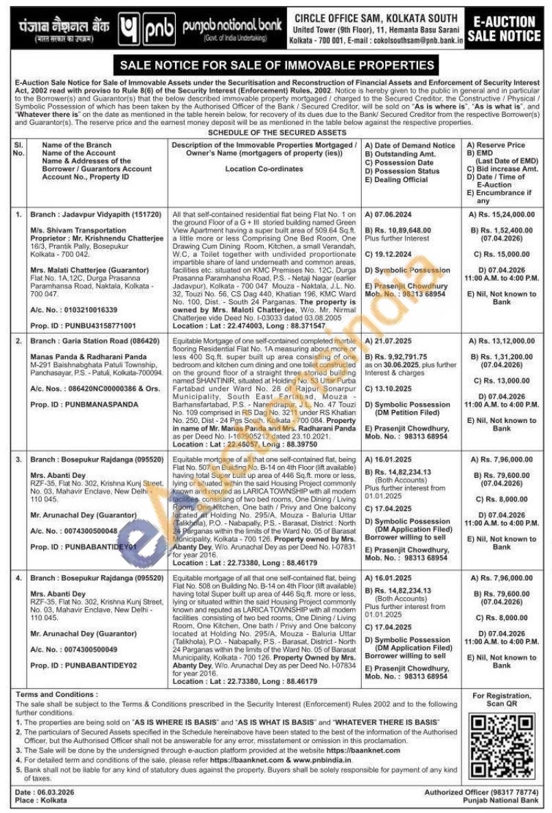 Equitable mortgage of all that one self-contained flat, being Flat No. 507 on Building No. 8-14 on 4th Floor (lift available) having total Super built up ansa of 446 Sq.ft. more or less, lying or situated within the said Housing Project commoriy known and reputed as LARICA TOWNSHIP with all modem facilities consisting of two bed rooms. One Dining/Living Room, One Kitchen, One bath/Privy and One balcony located at Holding No. 295/A, Mouza - Baluria Uttar (Talkhola), PO.-Nabapaly, P.S.-Barasat, District: North 24 Parganas within the limits of the Ward No. 05 of Barasat Municipality, Kolkata-700 126. Property owned by Mrs. Abanty Dey. Wo. Arunachal Dey as per Deed No. 1-07831 Mrs. Abanti Dey RZF-35, Fiat No. 302, Krishna Kunj Street, No. 03. Mahavir Enclave, New Delhi-110 045. Mr. Arunachal Dey (Guarantor) A/c. No.: 0074300500048 Prop. ID: PUNBABANTIDEY01 for year 2016