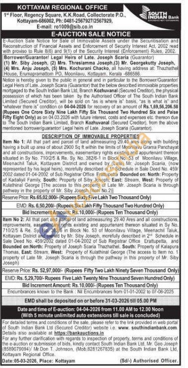 All that part and parcel of land admeasuring 29.40 Ares and all constructions, Improvements, easementary rights existing and appurtenant thereon situated in Sy No. 710/2/5 & Re. Sy. No. 382/6 in Block No. 53 of Moonilavu Village, Meenachil Taluk, Kottayam District and owned by Mr. Siby Joseph, morefully described in 2 Schedule in Sale Deed No. 459/2002 dated 01-04-2002 of Sub Registrar Office Erallupetta, and Bounded on: North: Property of Joseph Scaria Thazhathel. South: Property of Kalapura Thomas, East: Stream, West: Property of Kulathinal George (The access to lem no 1 property of Late Mr. Joseph Scaria is through the pathway in this property of Mr. Siby Joseph)