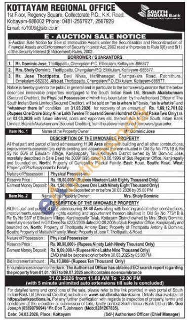 All that part and parcel of land admeasuring 38.46 Ares along with building and all other constructions. improvements.easementary rights existing and appurtenant thereon situated in Old Sy No 773/18 & Re Sy No 98/7 of Elkulam Vilage, Kanjirappally Taluk Kottayam District owned by Mrs. Sholy Dominic morefully described in Gift Deed No 4223/2005 dated 20.09.2005 of Sub Registrar Office. Kanjirapally and bounded on, North: Property of Thottipattu Antony East: Property of Thottipattu Antony & Dominic South: Property of Mattathil Family West: Property of Jose T. Thottipattu & Road