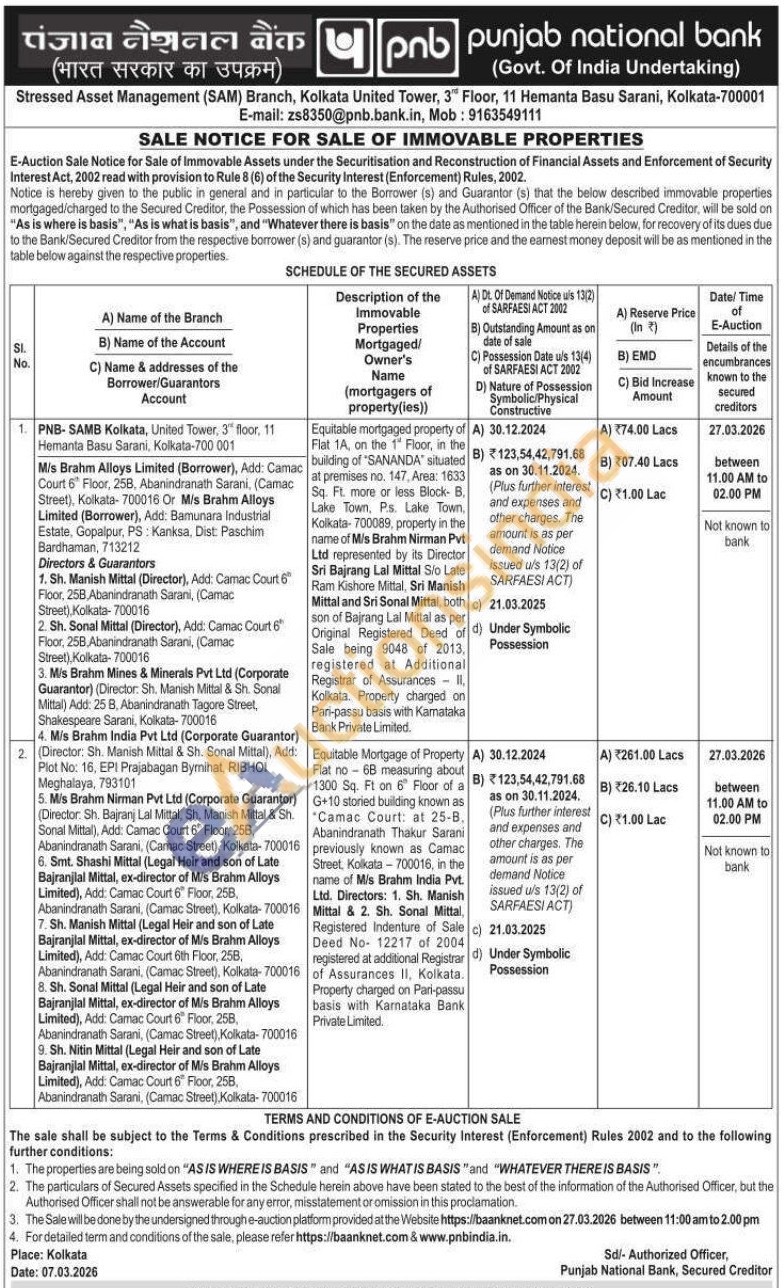 Equitable mortgaged property of Flat 1A, on the 1 Floor, in the building of "SANANDA" situated at premises no. 147, Агва: 1633 Sq. Ft. more or less Block B. Lake Town, Ps. Lake Town, Kolkata-700089, property in the name of M/s Brahm Nirman Pvt Ltd represented by its Director Sri Bajrang Lal Mittal S/o Late Ram Kishore Mittal, Sri Manish Mittal and Sri Sonal Mittal, both c) son of Bajrang Lal Mittal as per Original Registered Deed of d) Sale being 9048 of 2013, registered at Additional Registrar of Assurances II, Kolkata Property charged on Pari-passu basis with Kamataka Bank Private Limited.