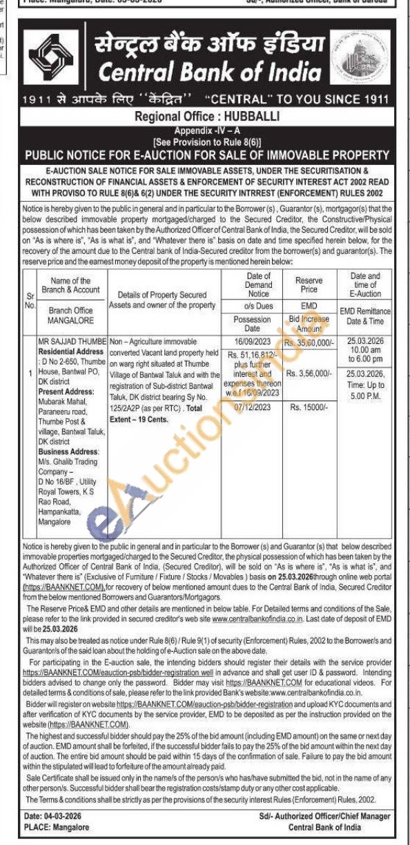 Non-Agriculture immovable converted Vacant land property held on warg right situated at Thumbe Village of Bantwal Taluk and with the registration of Sub-district Bantwal Taluk, DK district bearing Sy No. 125/2A2P (as per RTC). Total Extent-19 Cents.