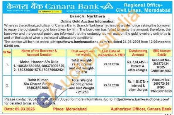 Canara Bank Gold Auctions Auction in Moradabad