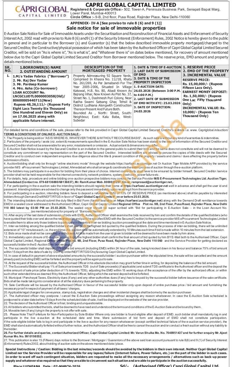Property Admeasuring 92 Square Yards, Comprised In Khasra No. 11//18, Khata No. 261/269, As Per Jamabandi For The Year 2005-2006, Situated In Village Kakowal, H.B. No. 80, Abadi Known As Bajrang Vihar, Now Known As Plot No. 37, Street No. 1, Dashmesh Puri Colony, Near District Ludhiana Alongwith Construction Radha Swami Satsang Ghat, Tehsil & Thereon Present And Future Both.Bounded As North: Street, South: Neighbour East: Kalu Baba, West: Subedar