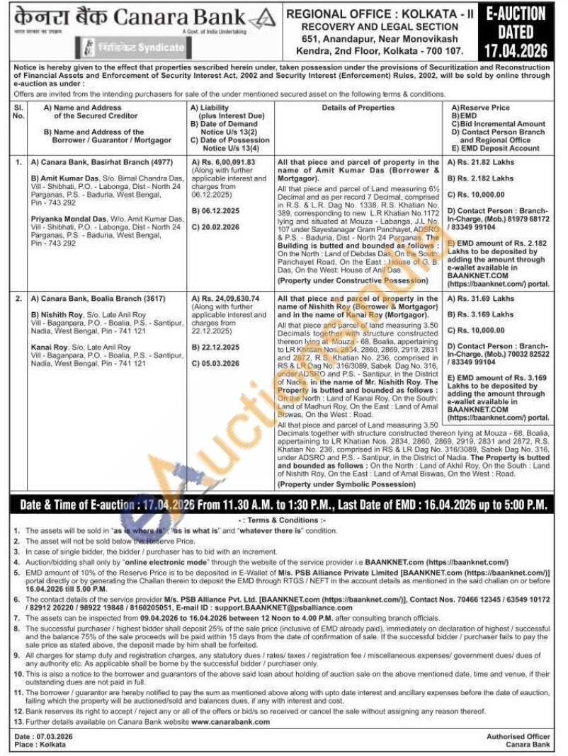 All that piece and parcel of property in the name of Amit Kumar Das (Borrower & Mortgagor): All that piece and parcel of Land measuring 6 1/2 Decimal and as per record 7 Decimal, comprised in R.S. & L.R. Dag No. 1338, R.S. Khatian No. 389, corresponding to new L.R Khatian No.1172 lying and situated at Mouza - Labanga, J.L. No. 107 under Sayestanagar Gram Panchayet, ADSRO & P.S. Baduria, Dist-North 24 Parganas. The Building is butted and bounded as follows: On the North: Land of Debdas Das, On the South: Panchayet Road. On the East: House of G. B. Das. On the West: House of Anil Das