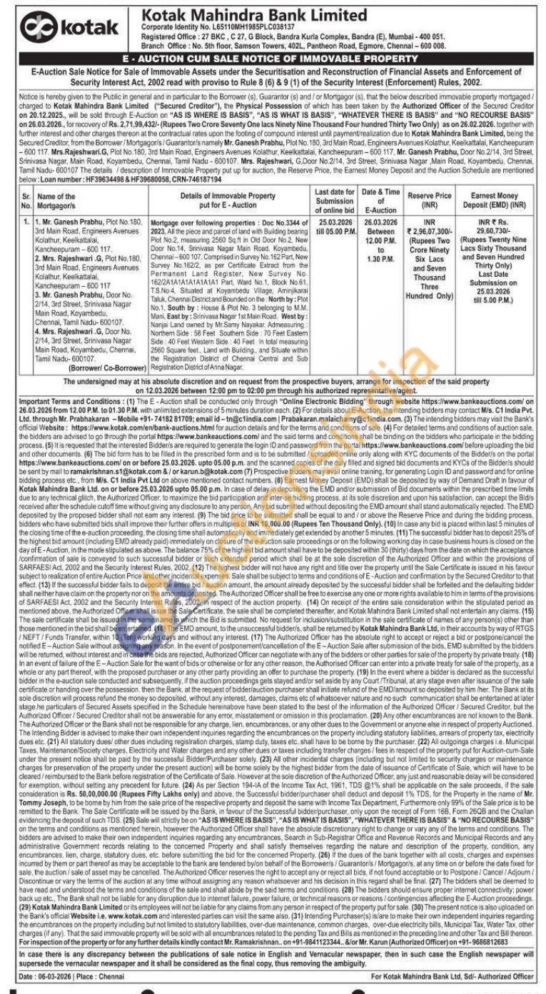 Mortgage over following properties: Doc No.3344 of 2023, Al the plece and parce of land with Building beng Plot No 2 measaing 2500 5ft in Old Door No2. Now Door Nis 14. Senivasa Nagar Main Road Koyembedu Chemal-600 Chennal -800 107. 107. Compraedin Compraedin Survey Sunny No. No.1 162 Part. Now Survey No. 1622. spur Certificale Extrad from the Permanent Land Register, New Survey No 12QATATATATALATAT Part. Ward No. Block Not TS No 4 Suted Kayanted Village Axinikana Taluk Chennai Dioctand Bounded on the North by: Phot No.1. Bouth by House & Plot No. 3 belonging to MM. Mans, East by: Sagor Man Road, West by Nama Land owned by Mr.Samy Nayakar Admessung Northem Side 68 Feel Southern Side 70 Fleet Castam Size: 40 Feet Western Side 40 Feet ning 2560 Sosane feet, Land with Bunting, and Sitiate wit the Registration District of Chennai Centre and Sub Registration District of Arna Nagar