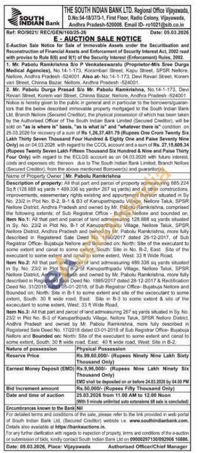 Item No.3: All that part and parcel of land admeasuring 267 sq yards situated in Sy. No. 23/2 in Plot No. 8-3 of Kanuparthipadu Village, Nellore Taluk, SPSR Neliore District, Andhra Pradesh and owned by Mr. Pabolu Ramkrishna, more fully described in Registered Sale Deed No. 17/2018 dated 03-01-2018 of Sub Registrar Office- Bujabuja Nellore and Bounded on: North: Site of the executant to some extent and canal to some extent, South: 30 ft wide road, East: 40 ft wide road, West: Site in B-2