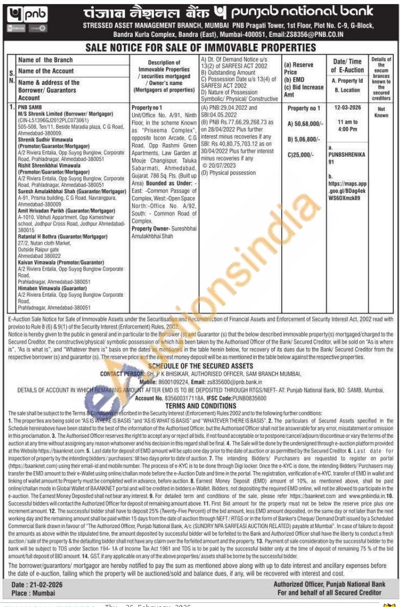 Unit/Office No. A/91, Ninth Floor, in the scheme Known as "Priseema Complex, opposite Iscon Arcade, CG Road, Opp Rashmi Green Apartments, Law Garden at Mouje Changisput, Taluka Satiarmati, Ahmedabad, Gojarat. 786 Sq. Fts. (Built up Areal Bounded as Under: East -Common Passage of Complex, West:-Open Space North:-Office No. A/92. South Comman Road of complex