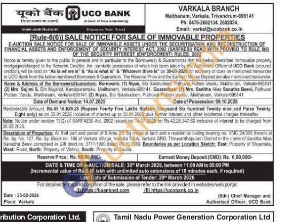 Description of Properties: All that part and parcel of 5 Ares 3.5 Sq meter of land and a residential builing bearing no. VMC 24/305 therein at Re. Sy No. 127, Re. Sy Block no. 186 of Varkala Village, Varkala Taluk, Varkala SRO, Thiruvanthapuram District in the name of Sanitha Alias Sanucha Beevi comprised in Gill deed no. 3711/1980 dated 06.10.1980. Boundaries as per Location Sketch: East: Property of Shyamala West: Road, North: Property of Vishnu, South: Property of Sauda