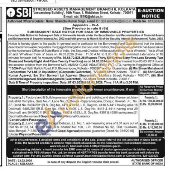Property 1: Factory land & Building measuring 66 sataks and building and shed thereon at Jalan Industrial Complex, Gate No.-1, Lane No-2, Mouza-Bipprannapara, Domjur, Howrah. J.L. No. 27. Deed No. 5404/2011 RS. Dag No. 4411 & 4412, LS. Dag No. 4416 & 4417 having area 16 Decimal), 5405/2011 R.S. Dag No. 4408 & 4409, L.S. Dag No. 4413 & 4414 having area 29 Decimal) and 5406/2011 (RS. Dag No. 4352 & 4353, L.S. Dag No. 4357 & 4358 having area 21 Decimal) in the name of Gopal Agarwal-Personal Guarantor