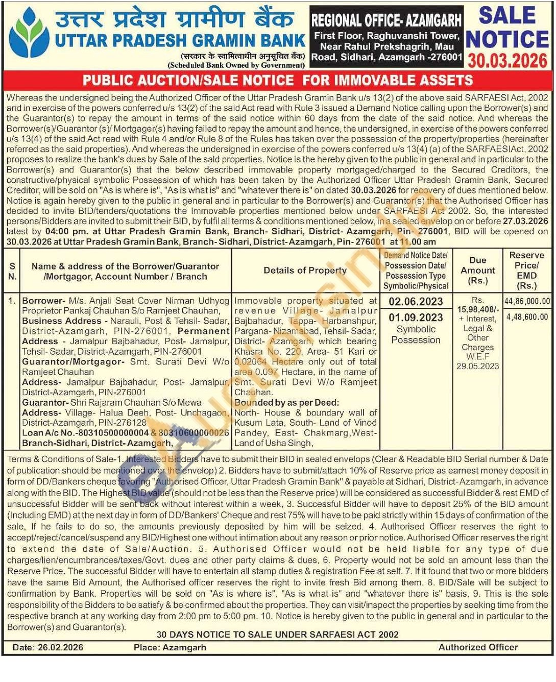 Immovable property situated at revenue Village Jamalpur Bajbahadur, Tappa- Harbanshpur, Pargana-Nizamabad, Tehsil-Sadar, District- Azamgarh, which bearing Khasra No. 220. Area 51 Kari or 0.02064 Hectare only out of total area 0.097 Hectare, in the name of Smt. Surati Devi W/o Ramjeet Chauhan.