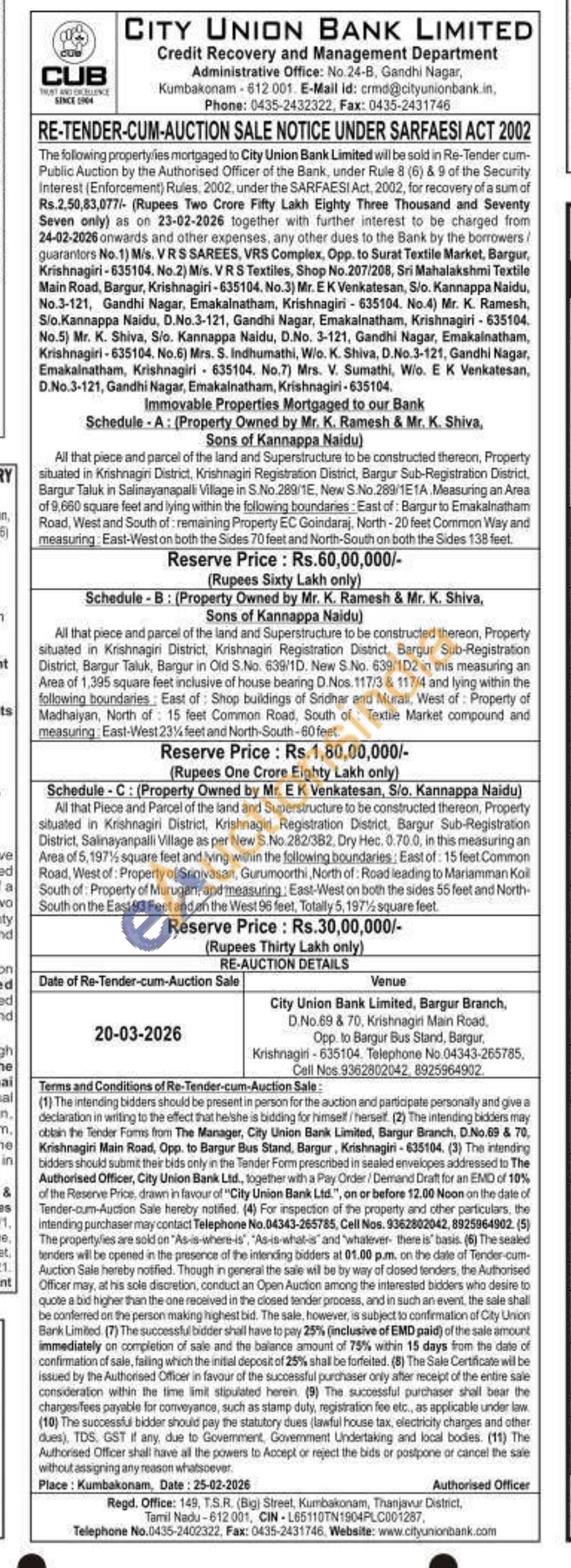 All that piece and parcel of the land and Superstructure to be constructed thereon, Property situated in Krishnagiri District, Krishnagin Registration District, Bargur Sub-Registration District, Bargur Taluk, Bargur in Old S.No. 639/1D. New S.No. 639/1D2 in this measuring an Area of 1,395 square feet inclusive of house bearing D.Nos. 117/3 & 117/4 and lying within the following boundaries: East of Shop buildings of Sridhar and Murali, West of: Property of Madhaiyan, North of 15 feet Common Road, South of Textile Market compound and measuring East-West 23% feet and North-South-60 feet.