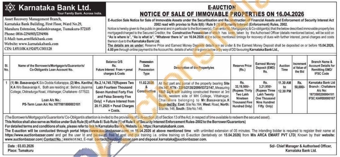 All that part and parcel of the property bearing Site No.147, KTN-2205/2130/2099/5372/147, Measuring 1500 Sq.ft with building constructed thereon at 3rd Block, western side of MH College, Vittalnagar, Challakere belonging to Mr.Basavaraja.K Bounded By: East: Site No. 164, West: Road, North: Site No. 146, South: Site No. 148