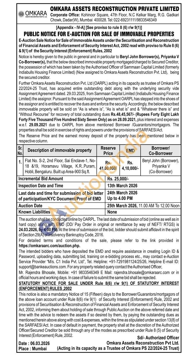 Flat No. S-2, 2nd Floor, Sai Enclave-1, No-18 &19, Horamavu Village, K.R..Puram, Hobli, Bengaluru. Built up Area-900 Sq.ft.