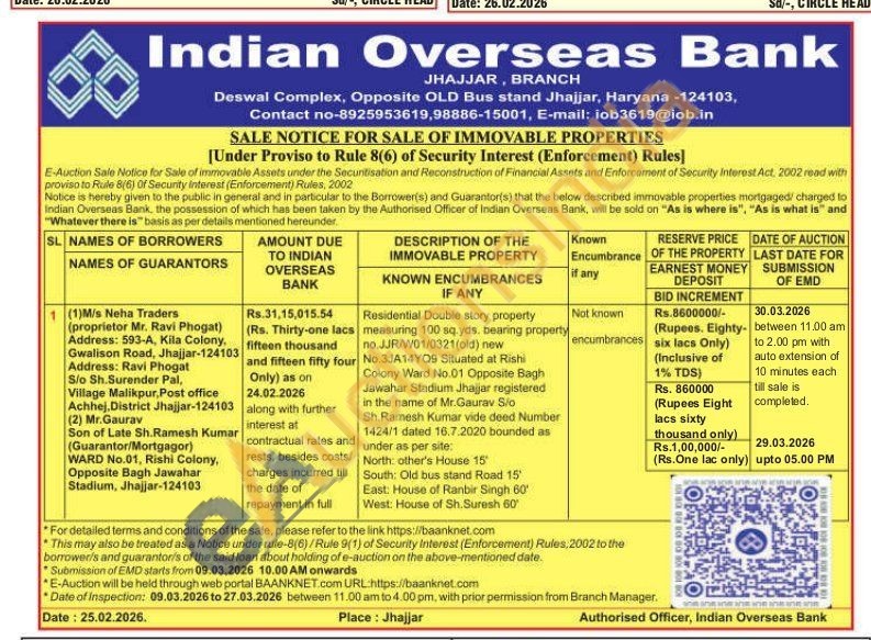 Residential Double story property measuring 100 sq yds. bearing property no.JJR/W01/0321(old) new No.3JA14YQ9 Situated at Rishi Colony Ward No.01 Opposite Bagh Jawahar Stadium Jhajjar registered in the name of Mr.Gaurav Slo Sh. Ramesh Kumar vide deed Number 1424/1 dated 16.7.2020 bounded as under as per site: North: other's House 15 South: Old bus stand Road 15' East. House of Ranbir Singh 60 West: House of Sh.Suresh 60