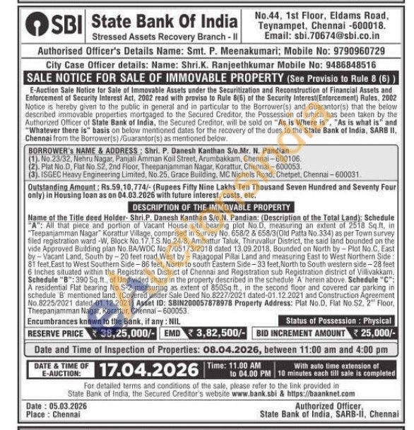 Name of the Title deed Holder- Shri.P. Danesh Kanthan S/o.N. Pandian: (Description of the Total Land): Schedule "A": All that plece and portion of Vacant House site bearing plot No.D, measuring an extent of 2518 Sq.ft. in "Teepanjamman Nagar Korattur Village, comprised in Survey No. 658/2 & 658/3(Old Patta No.334) as per Town survey filed registration ward-W, Block No.17.Т.5. No. 24/8, Ambattur Taluk, Thiruvallur District, the said fand bounded on the vide Approved Building plan No.BA/WDC No.7/05173/2018 dated 13.09.2018. Bounded on North by-Plot No.C, East by-Vacant Land, South by-20 feet road, West by Rajagopal Pillai Land and measuring East to West Northern Side: 81 feet, East to West Southern Side-86 feet, North to south Eastern Side-33 feet, North to South western side-28 feet 6 Inches situated within the Registration District of Chennai and Registration sub Registration district of Villivakkam Schedule "B": 390 Sq.ft. of Undivided share in the property described in the schedule A herein above. Schedule "C": A residential Flat bearing No.S-2 measuring as extent of 850Sq. ft., in the second floor and covered car parking in schedule B' mentioned land. (Covered under Sale Deed No. 8227/2021 dated 01.12.2021 and Construction Agreement No.8225/2021 dated-01.12.2021) Asset ID: SBIN200057878978 Property Address: Plat No.D, Flat No.S2. 2 Floor, Theepanjamman Nagar, Korattur, Chennai-600053