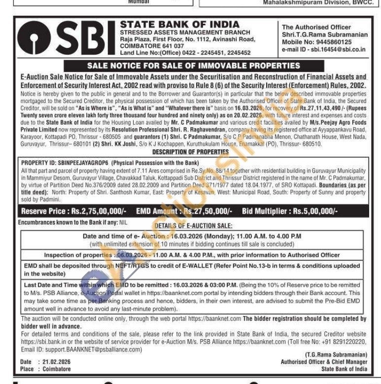 All that part and parcel of property having extent of 7.11 Ares comprised in Re.Sy. No. 88/14 together with residential building in Guruvayur Municipality in Mammiyur Desom, Guruvayur Village, Chavakkad Taluk, Kottappadi Sub District and Thrissur District registered in the name of Mr. C Padmakumar, by virtue of Partition Deed No.376/2009 dated 28.02.2009 and Partition Deed 371/1977 dated 18.04.1977, of SRO Kottapadi. Boundaries (as per title deed): North: Property of Shri. Santhosh Kumar, East: Property of Kesavan, West: Municipal Road, South: Property of Sunny and property sold by Padmini.