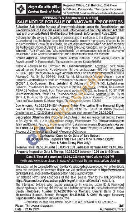 Description Of Immovable Property: 04.25 Ares of land and residential building therein in Re. Sy No. 96/14-2 in Uliyazhthura village, Powdikonam PO, Thiruvananthapuram Taluk and District. Property in the name of Mr. Lakshminarayanan. Boundaries:-As per sale deed-As per Title Deed: East: Paddy Field, West: Property of Chittooru, North: Property of Chempakasseri, South-Property of Chittooru