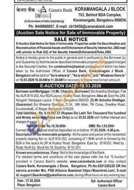 Description of the immovable property: All the piece and parcel of the residential property bearing flat no: ALR B19 202, consisting of 1 BHK which is formed by the BDA in the layout ALUR at Huskur Road, Bangalore, East by: 819/203, West by: Road, North by: Block No: 18, South by: B 19/201