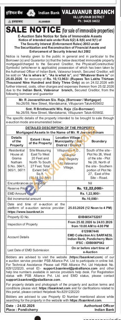 Residential House at Grama Natham S.No. 364/1, 365/1, 367/1East To West Site Measuring 20 Feet and North To South 27 Feet Total Extent 540 Sq.ft. (50.18 Sq. Mtr.) Villupuram RD., Valavanur Sub-Registry At Valavanur Village.