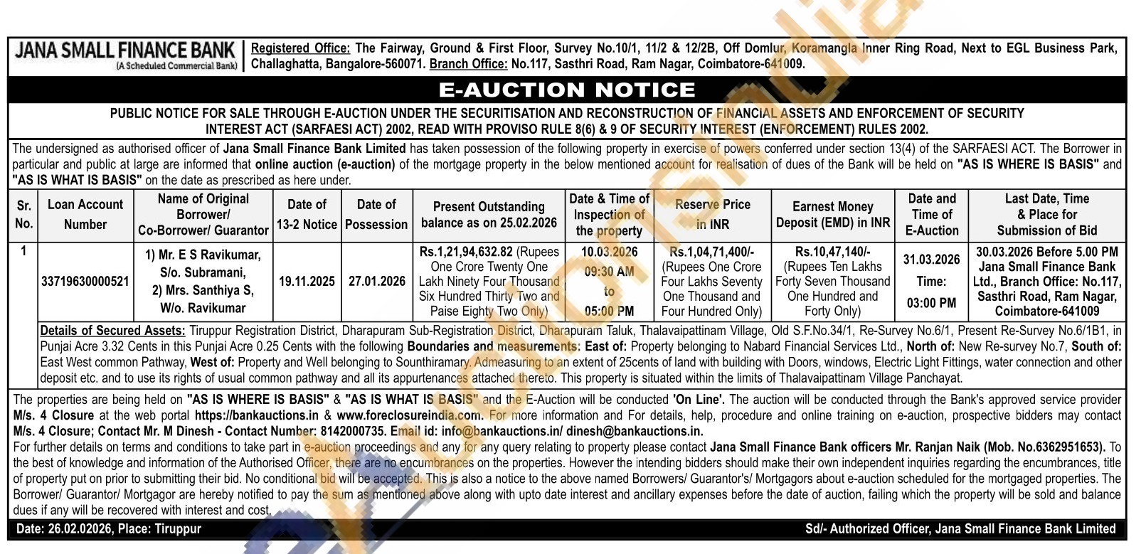 Details of Secured Assets: Tiruppur Registration District, Dharapuram Sub-Registration District, Dharapuram Taluk, Thalavaipattinam Village, Old S.F.No.34/1, Re-Survey No.6/1, Present Re-Survey No.6/1B1, in Punjai Acre 3.32 Cents in this Punjai Acre 0.25 Cents with the following Boundaries and measurements: East of: Property belonging to Nabard Financial Services Ltd., North of: New Re-survey No.7, South of: East West common Pathway, West of: Property and Well belonging to Sounthiramary. Admeasuring to an extent of 25cents of land with building with Doors, windows, Electric Light Fittings, water connection and other deposit etc. and to use its rights of usual common pathway and all its appurtenances attached thereto. This property is situated within the limits of Thalavaipattinam Village Panchayat.