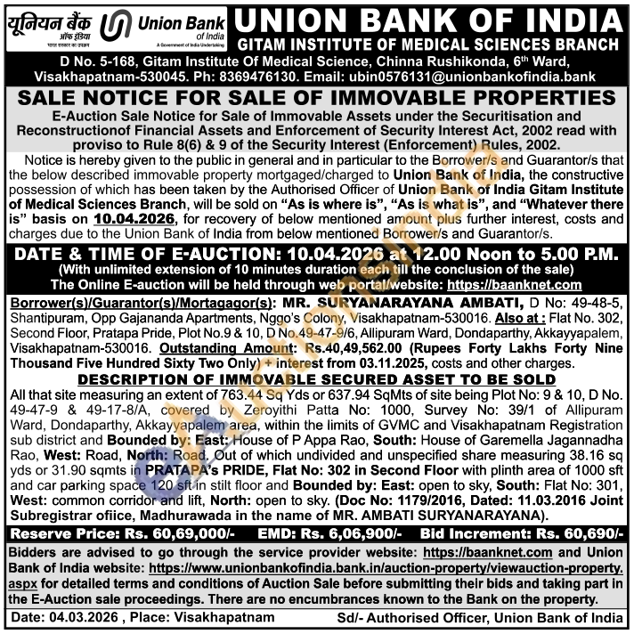 All that site measuring an extent of 763.44 Sq Yds or 637.94 SqMts of site being Plot No: 9 & 10, D No. 49-47-9 & 49-17-8/A, covered by Zeroyithi Patta No: 1000, Survey No: 39/1 of Allipuram. Ward, Dondaparthy, Akkayyapalem area, within the limits of GVMC and Visakhapatnam Registration sub district and Bounded by: East: House of P Appa Rao, South: House of Garemella Jagannadha Rao, West: Road, North: Road. Out of which undivided and unspecified share measuring 38.16 sq yds or 31.90 sqmts in PRATAPA'S PRIDE, Flat No: 302 in Second Floor with plinth area of 1000 sft and car parking space 120 sft in stilt floor and Bounded by: East: open to sky, South: Flat No: 301, West: common corridor and lift, North: open to sky. (Doc No: 1179/2016, Dated: 11.03.2016 Joint Subregistrar ofiice, Madhurawada in the name of MR. AMBATI SURYANARAYANA)