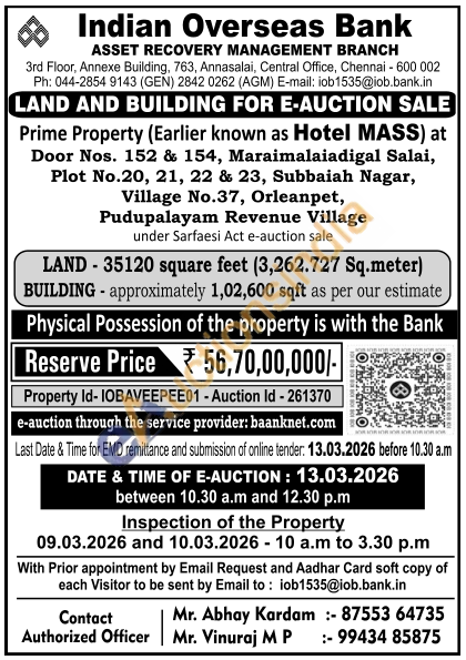 Prime Property (Earlier known as Hotel MASS) at Door Nos. 152 & 154, Maraimalaiadigal Salai, Plot No.20, 21, 22 & 23, Subbaiah Nagar, Village No.37, Orleanpet, Pudupalayam Revenue Village under Sarfaesi Act e-auction sale