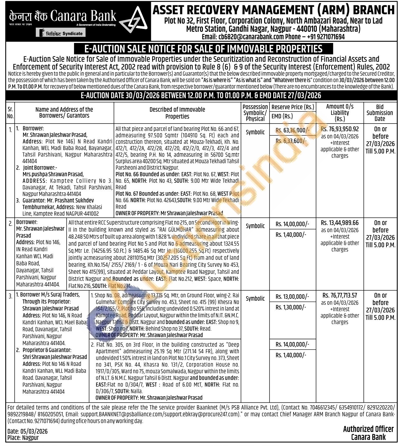 All that piece and parcel of land bearing Plot No. 66 and 67. admeasuring 97.500 Sqmtr (104910 Sq. Ft) each and construction thereon, situated at Mouza-Tekhadi, Kh. No. 472/1, 472/2A, 472/28, 472/20, 412/2/0, 472/3, 472/4 and 472/5, bearing P.H. No 14, admeasuring in 56700 Sq.mtr Surplus area 40200 Sq. Mtr situated at Mouza Tekhadi Tahsil Parsheoni and District Nagpur