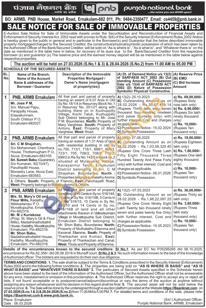 All that part and parcel of property consisting of 14 Cents in Sy no. 516/14A 5 Cents in Sy No. 516/14B, 5 Cents in Sy No. 516/15, 10 Cents in Sy No. 516/10 and 14 Cents in Sy no. 516/16B of land and all other attachments thereon in Velloorkunnam Village in Muvattupuzha Sub District, Ernakulam District belonging to Mr. Shon Babu. Boundaries: North: Property of Muthalathu Eliamma and Kavanal Eliamma, South: Property of Thankachan and Kumari, East: Property of Thankachan and Canal, West: Thodu and Property of Eliamma