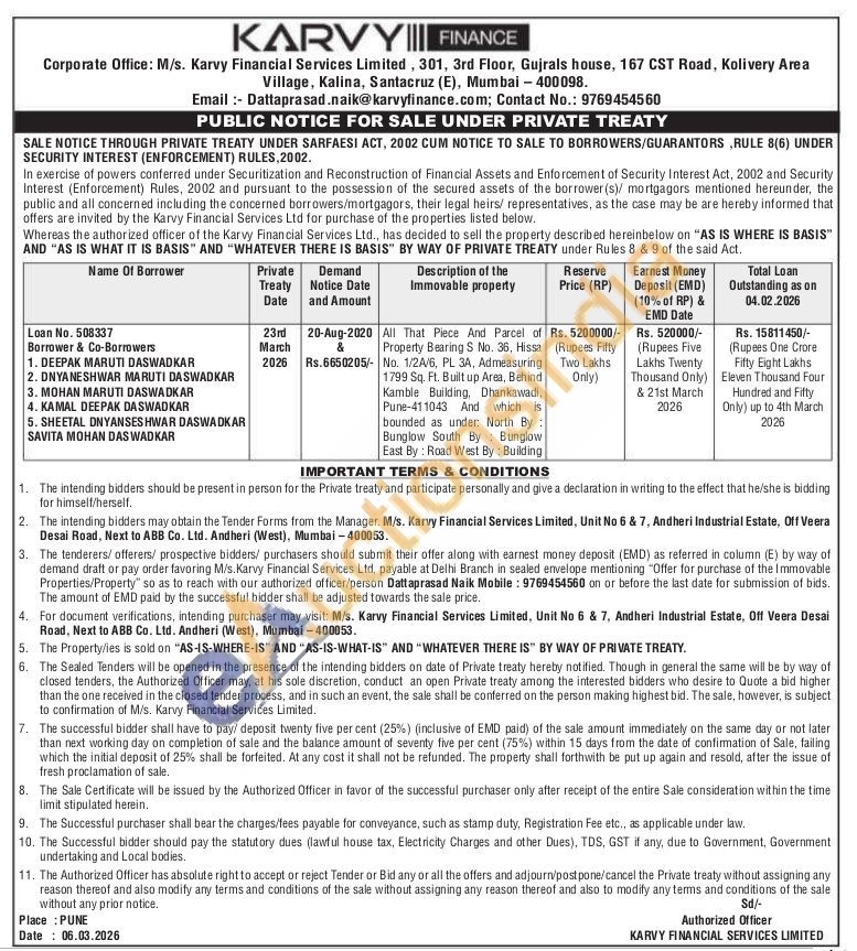 All That Piece And Parcel of Property Bearing S No. 36, Hissa No. 1/2A/6, PL 3A, Admeasuring 1799 Sq. Ft. Built up Area, Behind Kamble Building, Dhankawadi, Pune-411043 And which is bounded as under. North By: Bunglow South By Bunglow East By: Road West By: Building