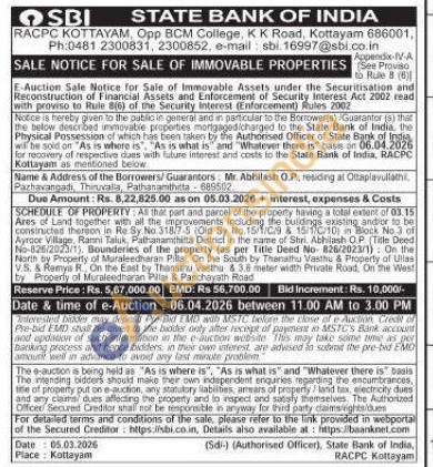 SCHEDULE OF PROPERTY: As that part and parcel of the property having a e property having a total extent of 03.15 Ayroor Village. Ranni Taluk, Ares of Land together with all all the improvements including the buildings existing and/or to be constricted thereon in Re Sy No 318/7-5 (Old Sy No. 15/1/09 & 15/10/10 Block No 3 of Village Ranni Taluk, Pathanamthitta District in the name of Shn. Abhilash Abhilash OP OP (Title No-826/2023(1), Bounderies of the property y (as per Title Deed No 826/2023/1): On the North by Property of Muraleedharan Pillai, On the South by Thanalhu Vasthu & Property of Ullas VS. & Remya R. On the East by Thanatho Vastu & 3.6 meter width Private Road, On the Wat by Properly of Muraleedharan Pilar & Panchayath Road