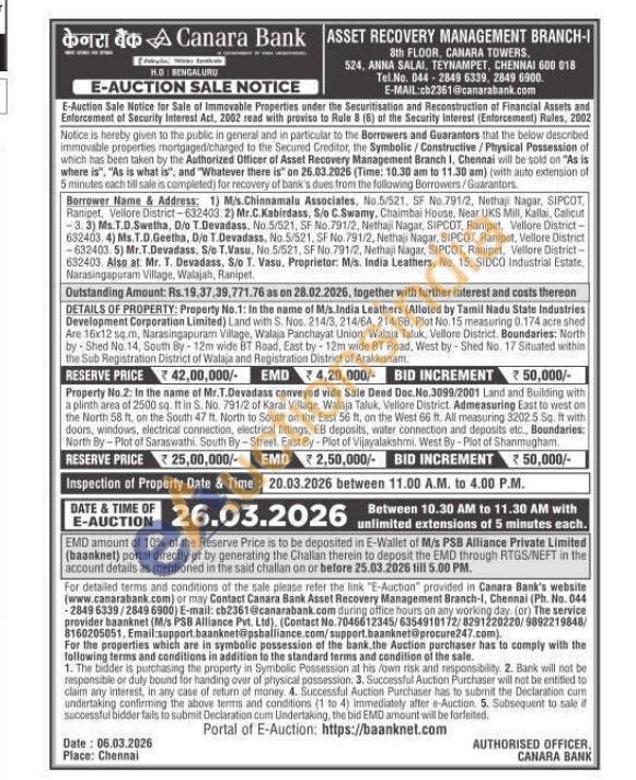 DETAILS OF PROPERTY: Property No.1: In the name of M/s India Leathers (Alinted by Tamil Nadu State Industries Development Corporation Limited) Land with S. Nos. 214/3, 214/6A, 214/68, Plot No. 15 measuring 0.174 acre shed Are 16x12 sq.m, Narasingapuram Village, Walaja Panchayat Union, Walaja Taluk, Vellore District. Boundaries: North by Shed No.14, South By-12m wide BT Read, East by 12m wide BT Road, West by-Shed No. 17 Situated within the Sub Registration District of Walaja and Registration District of Arakkonam