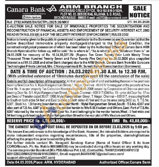 Details and full description of the property: All that part and parcel of land and building thereon in the premises bearing New Door No. 9, Mylai Ranganathan Street, T. Nagar, Chennai-600017 forming part of the property at New Door No. 9 as per property Tax Collection Receipt dated 28.06.2006 issued by Corporation of Chennai premises bearing Door No. 9/1, Mylai Ranganathan Street, T. Nagar, Chennai-600017 (Old No. 15-prior old Door No. 17 as per Deed of Transfer dated 30.07.1956) Mylai Ranganathan Street, T. Nagar. Chennai-600 017, measuring North to South on both sides 54 feet and East to West on both sides 45 feet and thus the area being 2430 sq. ft. T.S.No. 6387, Block No. 139 having boundaries as under: North: Mylal Ranganathan Street, South: T.S.No. 6387 and also part of T.S.No. 6387 plot sold by the vendor herein to M/s R.M.Visalam and Others, East: Part of T.S.No. 6387 retained by the vendor with new Door No. 9 and belonging to the vendor herein, West: 5 feet wide and 54 feet long path leading from Mylai Ranganathan Street to the rear plot of M/s Visalam and Others