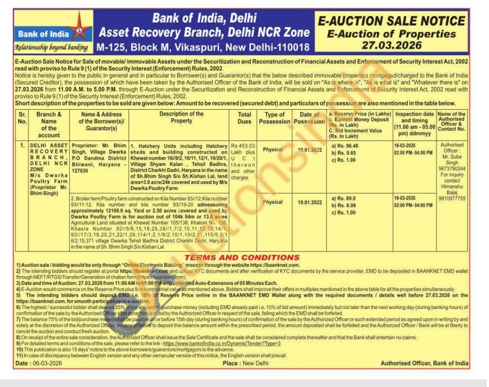 Broiler farm/Poultry farm constructed on Kila Number 93/12, Kila number 93//11-12, Kila number and kila number 93//19-20 admeasuring approximately 12100.0 sq. Yard or 2.50 acres covered and used by Dwarka Poultry Farm is for auction out of 104k 04m or 13.0 acres Agricultural Land situated at Khewat Number 105/138, Khatoni No. 138, Khasra Number 92//5/6,15,16,25,38//1,7/2,10,11,12,13,14/1, 93//17/3,18,20,21,22/1,26,114/1,2,1/9/2,10/1,10/2,11,115/5,6/1 6/2,15,371 village Dwarka Tehsil Badhra District Charkhi Dadri, Haryana in the name of Sh. Bhim Singh S/o Kishan Lal