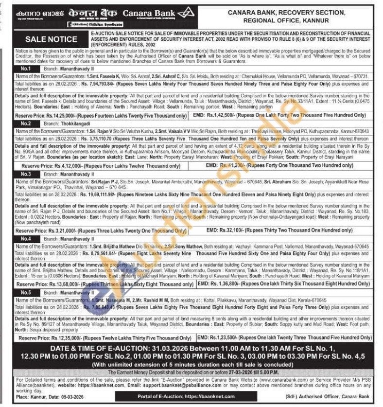 Details and full description of the immovable property: All that part and parcel of land and a residential building Comprised in the below mentioned Survey number standing in the name of Smt. Brijitha Mathew. Details and boundaries of the Secured Asset Village: Nalliopnadu. Desom: Kammana, Taluk Mananthavady. District Wayanad, Re. Sy. No. 118/1A1, Extent: 15 cents (0.0606 Hectors) Boundaries: East: Holding of Vazhayil Mariyam, North: Holding of Kavanal Mariyam: South: Panchayath Road: West: Hoding of Kavanal Mariyam