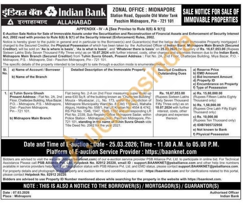 Flat being No. 2-A on 2nd Floor measuring super Build up area 630 Sq.ft. of the building known as "Chatterjee Building Mouza Miyabazar, JL No. 173, under the jurisdiction of Midnapore Municipality Ward No. 8 (Old) 11(New), Mahalla Aligunj, Holding No. 558/1, Hal LR Khatian No. 4554 & 4742 RS Plot No. 1546, 1547, 1548, 1550 and corresponding LR Plot No. 2339, Sub Registry Office Midnapore Sadar, within Police Station-Midnapore, Dist-Paschim Midnapore, Pin-721 101, standing in the name of Tuhin Suvra Ghosh vide Title Deed No. 2062 for the year 2021.