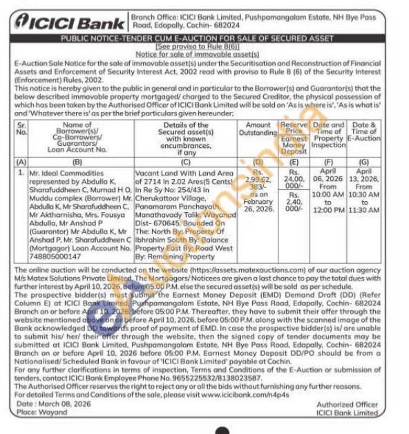 Vacant Land With Land Area of 2714 In 2.02 Ares (5 Cents) In Re Sy No: 254/43 in Cherukattoor Village, Panamaram Panchayath, Manathavady Talik, Wayanad Dist-670645. Bounded On The: North By: Property Of Ibhrahim South By: Balance Property East By: Road West By: Remaining Property