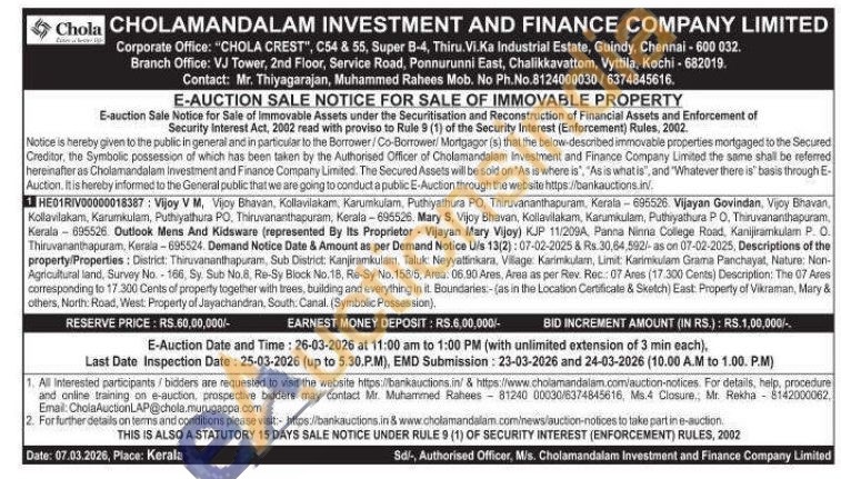 Descriptions of the property/Properties: District: Thiruvananthapuram, Sub District: Kanjiramkulam, Taluk: Neyyattinkara, Village: Karimkulam, Limit: Karimikulam Grama Panchayat, Nature: Non-Agricultural land, Survey No.166, Sy. Sub No.8, Re-Sy Block No. 18. Re-Sy No.158/5, Area: 06.90 Ares, Area as per Rev. Rec.: 07 Ares (17.300) Cents) Description: The 07 Ares corresponding to 17.300 Cents of property together with trees, building and everything in it. Boundaries-(as in the Location Certificate & Sketch) East Property of Vikraman, Mary & others, North: Road, West: Property of Jayachandran, South. Canal. (Symbolic Possession)