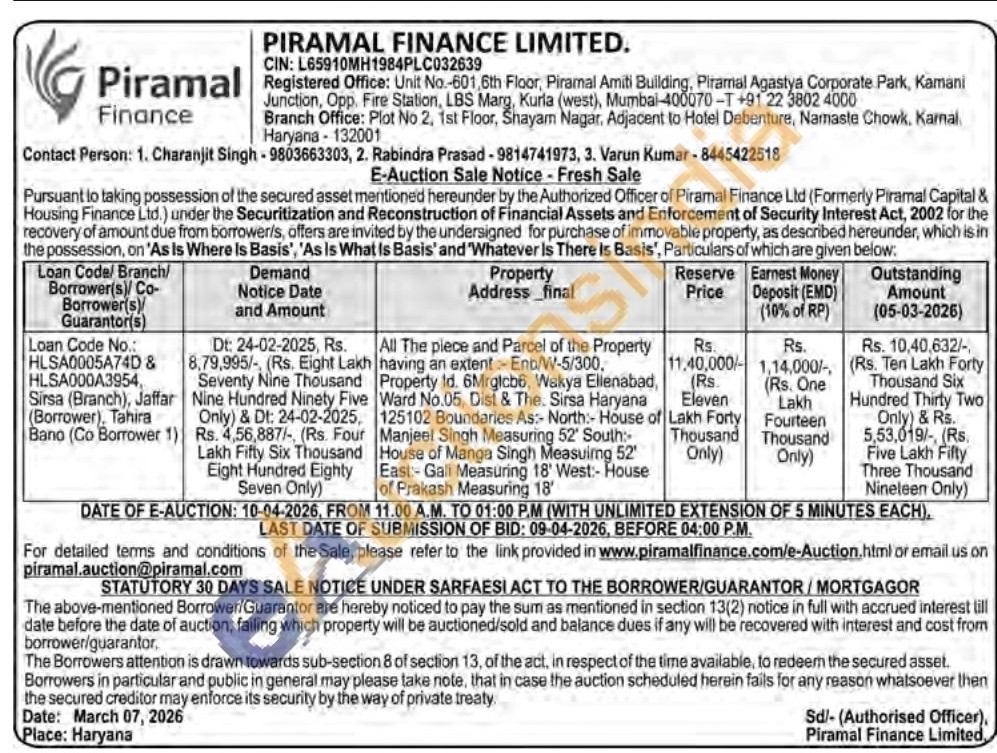 All The piece and Parcel of the Property having an extent :- Enb/W-5/300, Property Id. 6Mrgicb6, Wakya Ellenabad, Ward No.05, Dist & The. Sirsa Haryana 125102 Boundaries As:- North:- House of Manjeel Singh Measuring 52' South: House of Manga Singh Measuirng 52' East:-Gali Measuring 18' West:- House of Prakash Measuring 18'