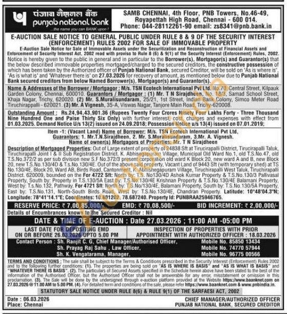Description of Mortgaged Properties: Out of Large extent of property of 24838 Sft at Tirucirapalli District, Tirucirapalli Taluk, Tiruchirapalli Joint I & II Sub Registration District. K. Abhisegapuram Village, Municipal Old Ward No.1, old T.S.No.47, old T.S.No.372/2 as per sub division new S.F No.372/3 present corporation old ward K Block 20, new ward A and B, new Block 20, new T.S.No. 130/40 & T.s.No. 130/4E. Out of the above said property, Vacant Land of 9443 Sit (with temporary shed) at TS No 130/4E, Block 20, Ward AB, Birds Road, Cantonment, K. Abhishegapuram Village, Tiruchirapalli West Taluk, Tiruchirapalli District 620009, bounded on the For 4722 Sft: North by: T.S. No130/40 Ashok Kumar Property & T.S.No.130/3 Pallivasal Property, South by: Property in T.S.130/SA East by: T.S.No. 130/4E Krishnan Property & T.S.No. 130/4E Balamani Property. West by by Ts. No. 132, Pathway. For 4721 Sit. North by: T.S. No/130/4E, Balamani Property, South by: TS.No. 130/5A Property, East by: T.S.No. 131, North-South Birds Road, West by: T.S.No. 130/4E, Chandran