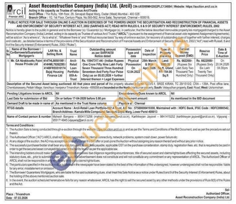 Description of the Secured Asset being auctioned: All that piece and parcel of the property situated in Sy No.1223/5-1, SREE KIRAN, TC 29/1510/2, CRA-139A, Post office lane Chembakassery, Pettah Village, Vanchiyur, Itaviperur Trivandrum, Kerala-696008 and bounded on the North: Harkumar property, South: Velayudhan property, East: Road, West: Usha mohan