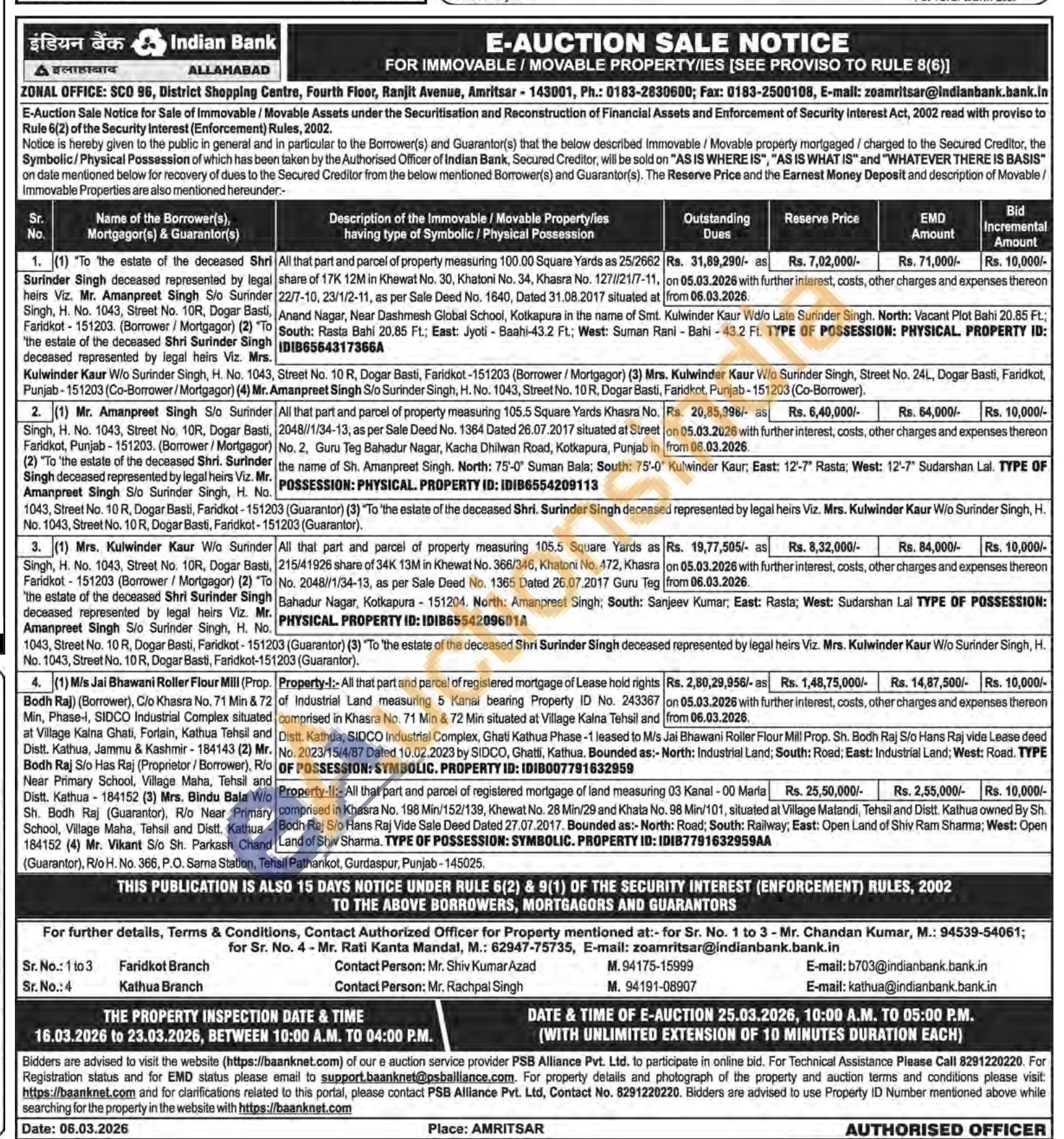 All that part and parcel of property measuring 105.5 Square Yards as 215/41926 share of 34K 13M in Khewat No. 366/346, Khatoni No. 472, Khasra No. 2048//1/34-13, as per Sale Deed No. 1365 Dated 26.07.2017 Guru Teg Bahadur Nagar, Kotkapura 151204. North: Amanpreet Singh, South: Sanjeev Kumar, East: Rasta; West: Sudarshan Lal