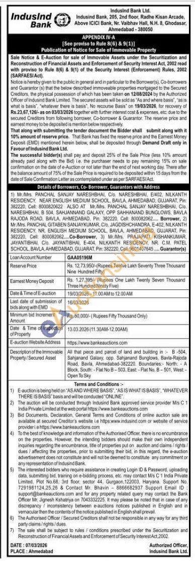 All that piece and parcel of land and building in B-504, Sahjanand Galaxy, opp. Sahjanand Bunglows, Bavla-Rajoda Road, Bavla, Ahmedabad-382220. Boundaries North A Block, South: -Flat No B-503. East-Flat No. B-501, West-Open To Sky