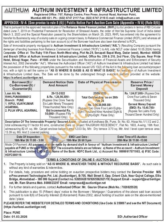 situated at Kondhawa Bk, Pune, Sr. No. 63, Hissa No. 1/1,1/2 and 2, total admeasuring 01 hector 80 arre, constructed there on project 'RAJGRUHI RECEDENCY, Fiat No. 1603, A-wing, 16th floor, admeasuring 82.41 sq. Mtr. Carpet enclose balcony area 12.03 Sq. Mtr. Dry terrace 3.70 sq. Mtr. And I level open terrace area 13.39 sq. Mtr. And 2 covered parking.