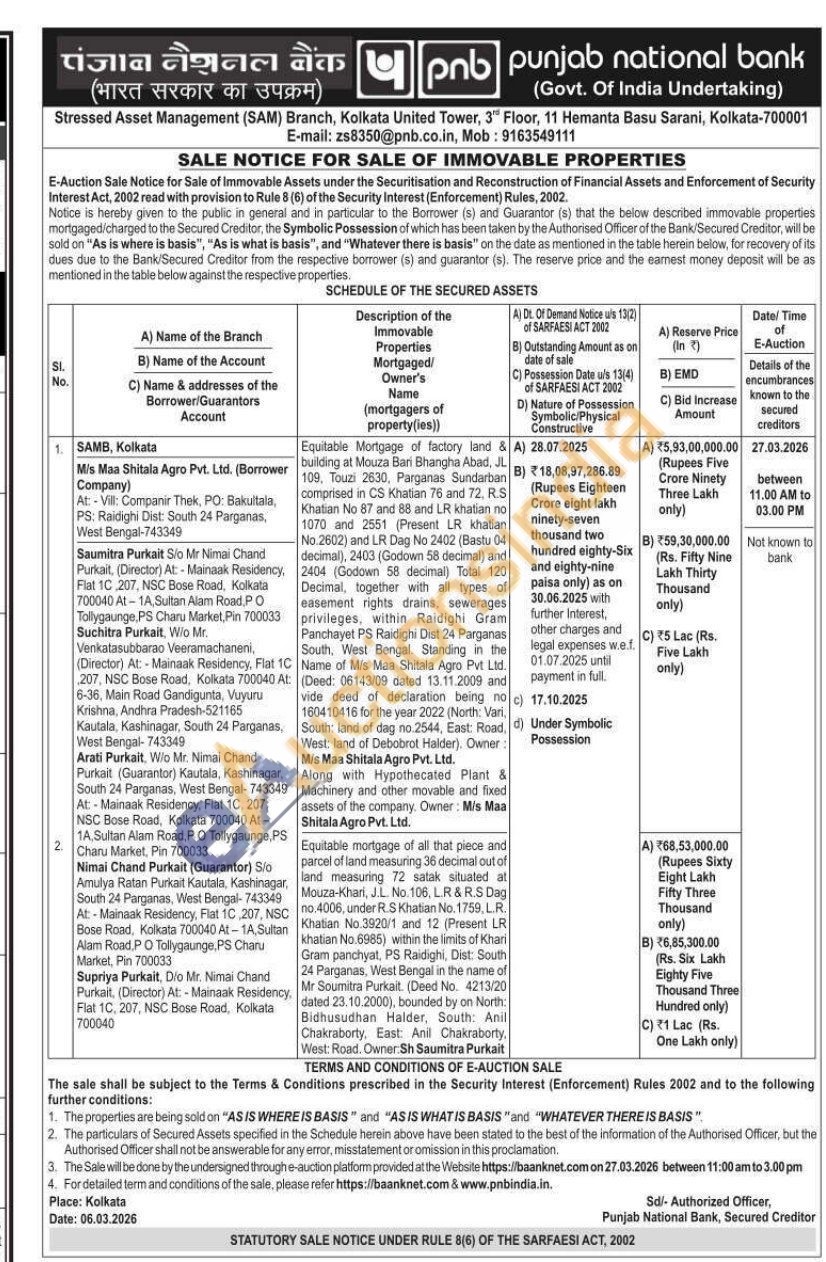 Equitable Mortgage of factory land & building at Mouza Bari Bhangha Abad, JL 109, Touzi 2630, Parganas Sundarban comprised in CS Khatian 76 and 72. R.S Khatian No 87 and 88 and LR khatian no 1070 and 2551 (Present LR khatian No.2602) and LR Dag No 2402 (Bastu 04 decimal), 2403 (Godown 58 decimal) and 2404 (Godown 58 decimal) Total 120 Decimal, together with all types of easement rights drains, sewerages privileges, within Raidighi Gram Panchayet PS Raidighi Dist 24 Parganas South, West Bengal Standing in the Name of Mis Maa Shitala Agro Pvt Ltd. (Deed: 06143/09 dated 13.11.2009 and vide deed of declaration being no 2) 160410416 for the year 2022 (North: Vari, South: land of dag no.2544, East: Road, d) West: land of Debobrot Halder). Owner M/s Maa Shitala Agro Pvt. Ltd.