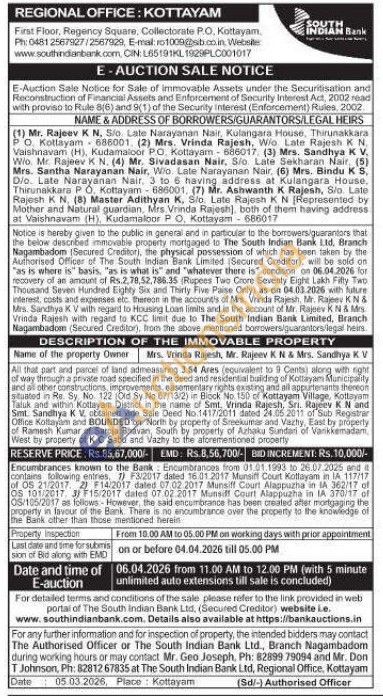All that part and parcel of land admeasuring 3.54 Ares (equivalent to 1 Cents) along with right of way through a private road specified in the deed and residential building of Kottayam Municipality and all other constructions, improvements easementary rights existing and all appurtenants thereon situated in Re. Sy No. 122 (Old Sy No 67/13/2) in Block No. 150 of Kottayam Village, Kottayam Taluk and within Kottayam District in the name of Smt. Vrinda Rajesh, Sri. Rajeev K. N and Simt. Sandhya K V očitained vide Sale Deed No 1417/2011 dated 24.06.2011 of Sub Registrar Office Kottayam and BOUNDED on North by property of Sreekumar and Vazhy, East by property of Ramesh Kumar of Saroja Bhavan, South by property of Azhaku Sundan of Varikkemadani, West by property of K C Sabu and Vazhy to the aforementioned property