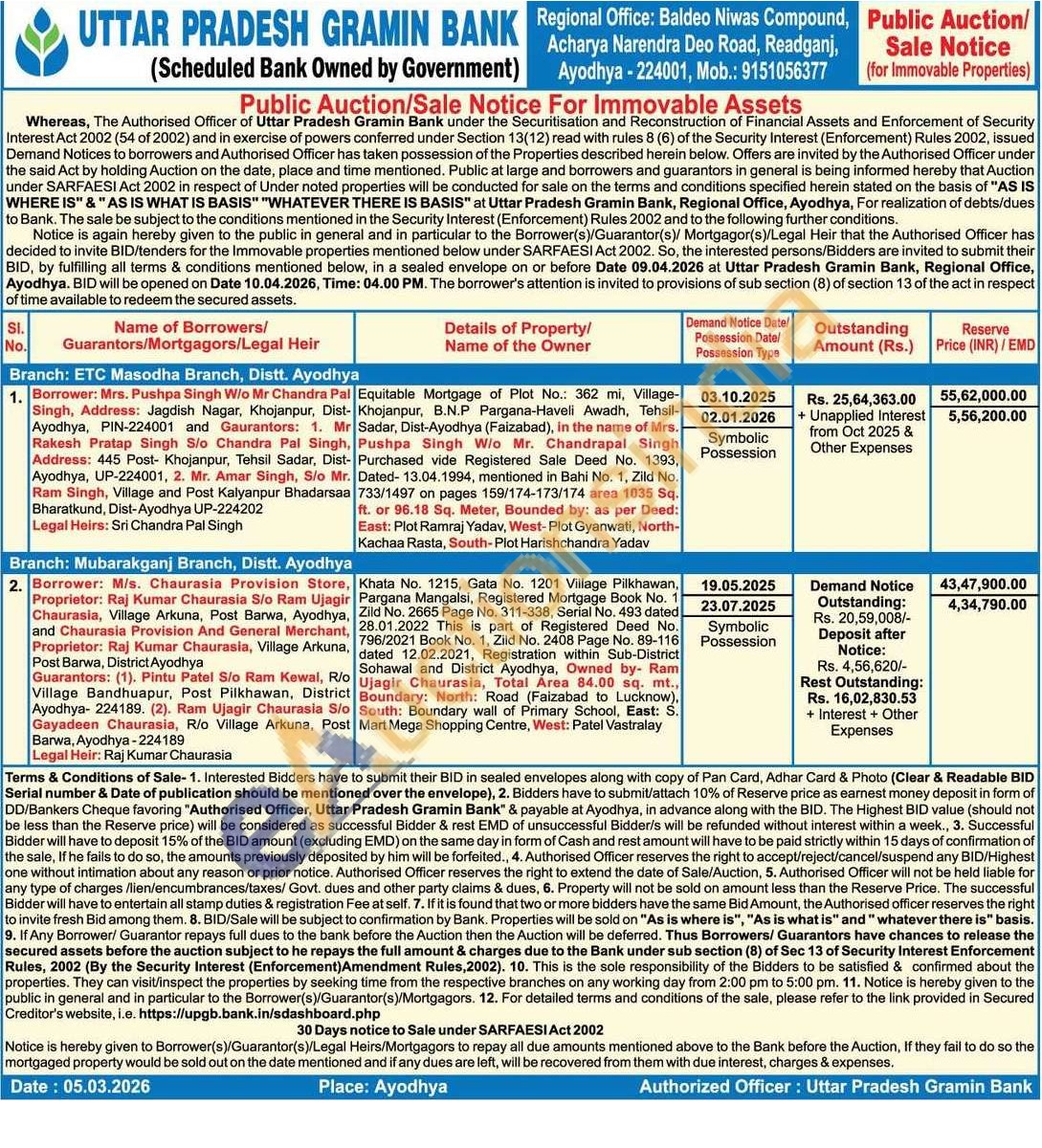 Equitable Mortgage of Plot No.: 362 mi, Village-Khojanpur, B.N.P Pargana-Haveli Awadh, Tehsil-Sadar, Dist-Ayodhya (Faizabad), in the name of Mrs. Pushpa Singh W/o Mr. Chandrapal Singh Purchased vide Registered Sale Deed No. 1393, Dated-13.04.1994, mentioned in Bahi No. 1, Zild No. 733/1497 on pages 159/174-173/174 area 1035 Sq. ft. or 96.18 Sq. Meter, Bounded by: as per Deed: East: Plot Ramraj Yadav, West-Plot Gyanwati, North-Kachaa Rasta, South-Plot Harishchandra Yadav