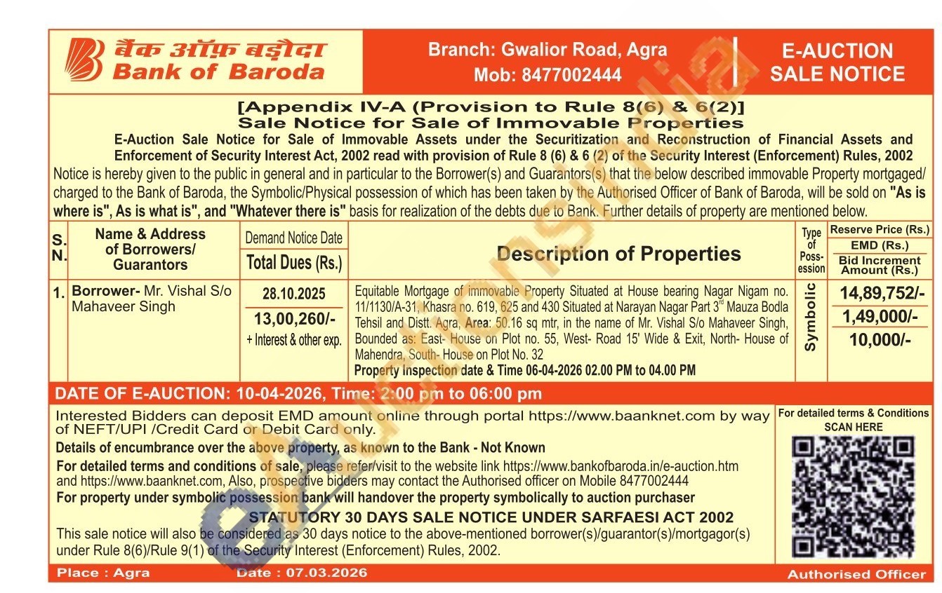 Equitable Mortgage of immovable Property Situated at House bearing Nagar Nigam no. 11/1130/A-31, Khasra no. 619, 625 and 430 Situated at Narayan Nagar Part 3 Mauza Bodla Tehsil and Distt. Agra, Area: 50.16 sq mtr, in the name of Mr. Vishal S/o Mahaveer Singh, Bounded as: East- House on Plot no. 55, West- Road 15' Wide & Exit, North- House of Mahendra, South- House on Plot No. 32